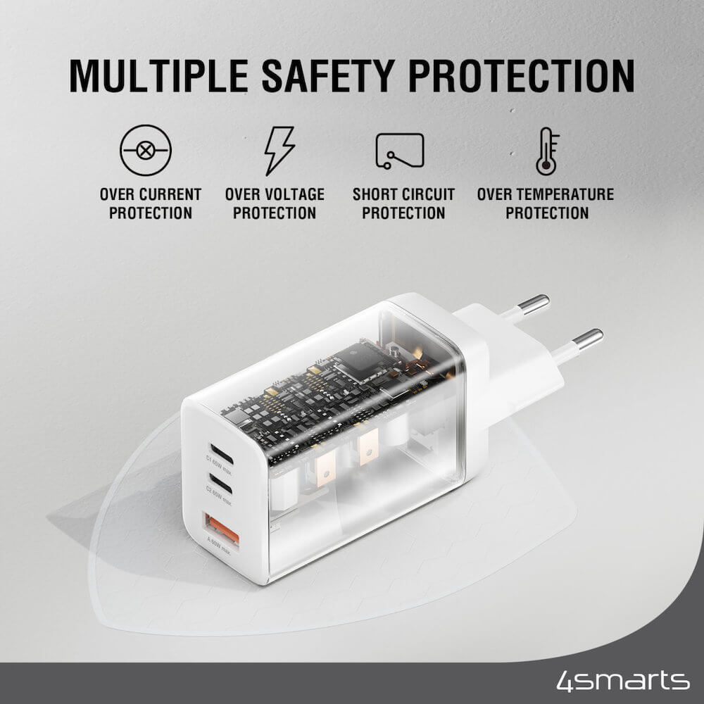Захранване за ел. мрежа с USB-A и 2xUSB-C изходи с технология за бързо зареждане - 4smarts GaN Wall Charger PDPlug Trio 65W (бял)