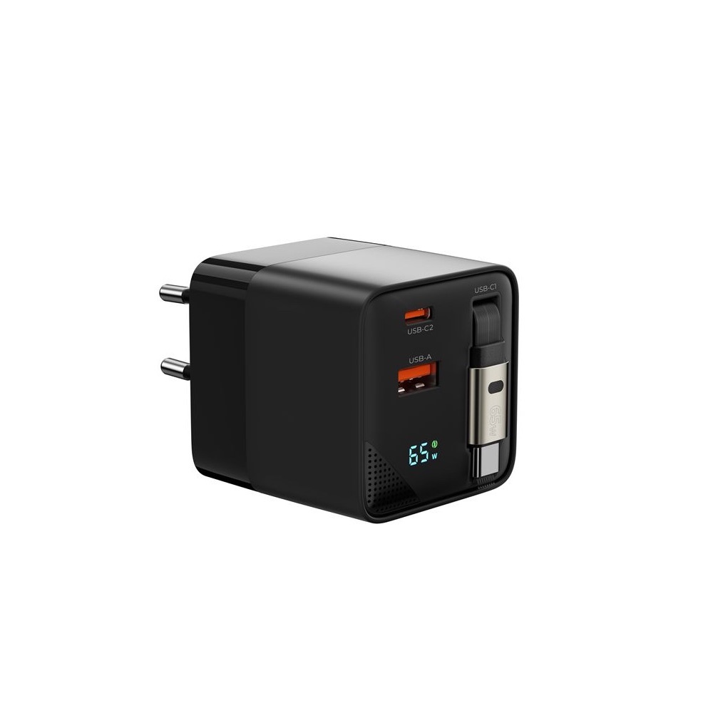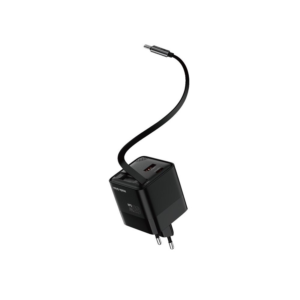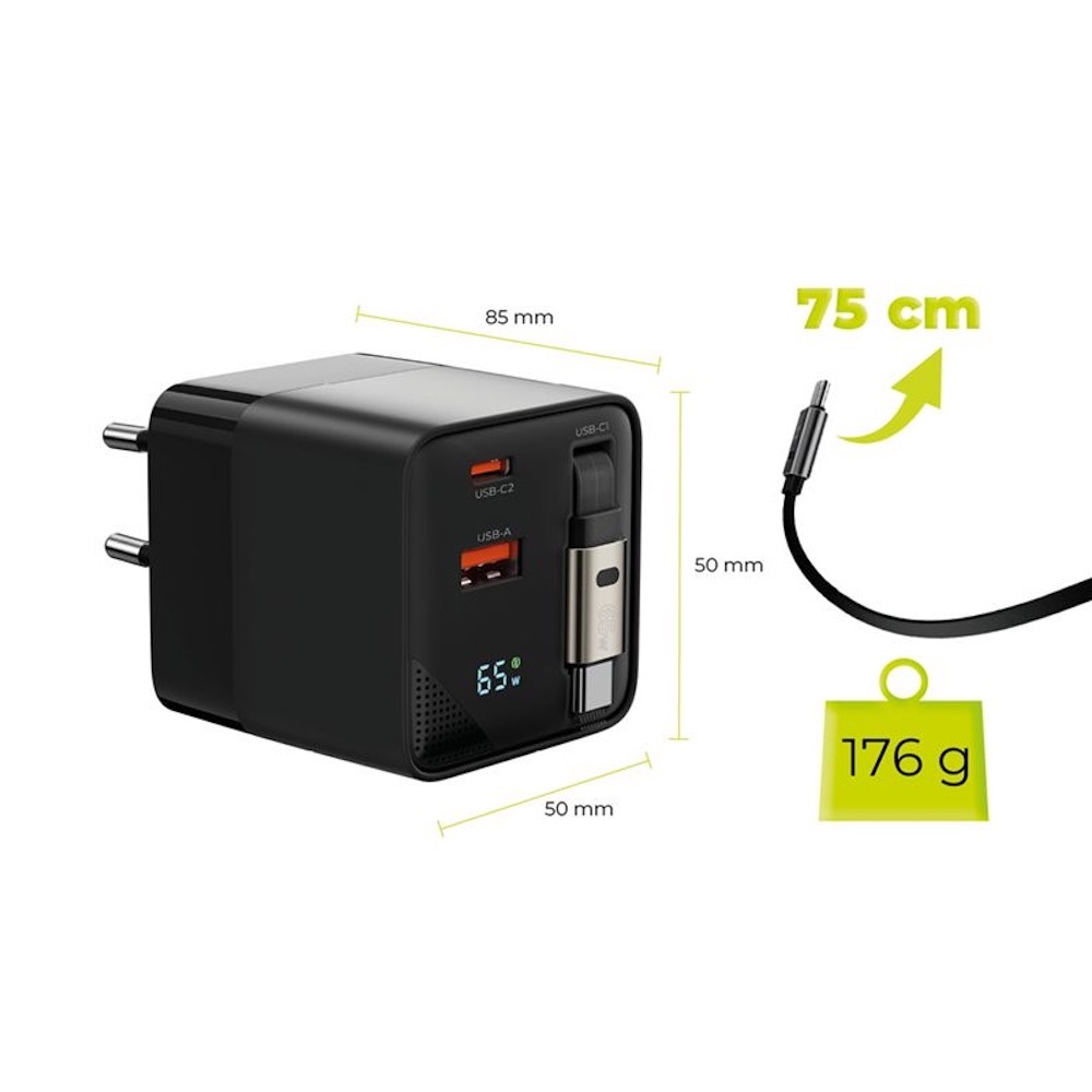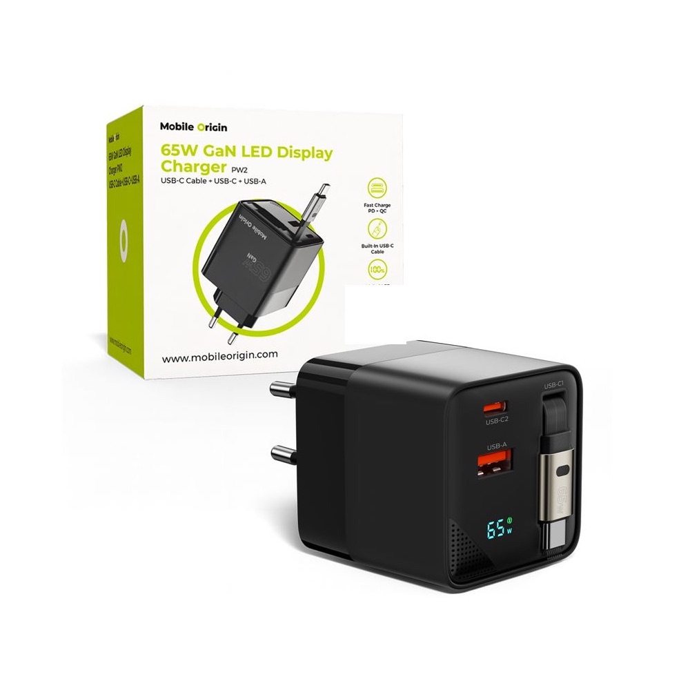 Захранване за ел. мрежа с USB-A и USB-C изходи и вграден USB-C кабел - Mobile Origin PW2 GaN Display Wall Charger 65W (черен)