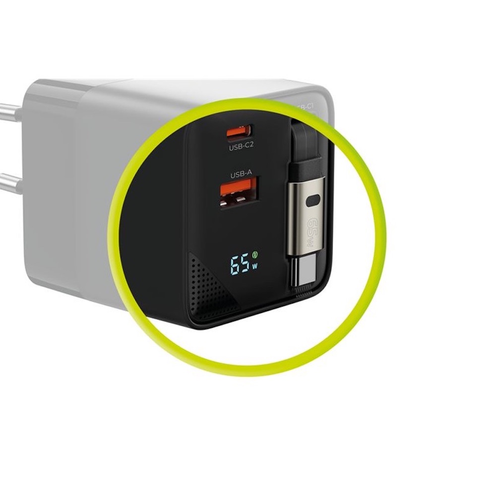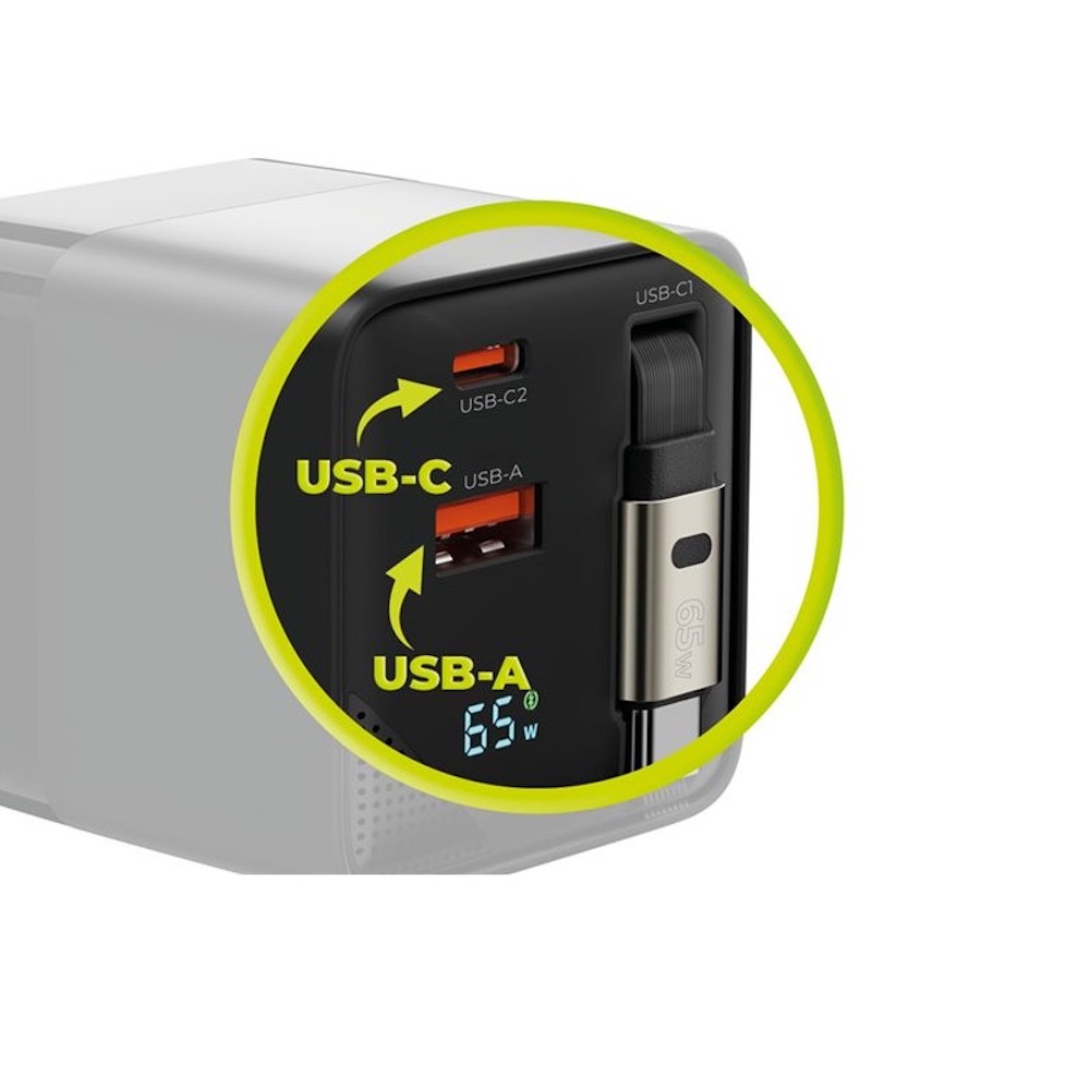 - Захранване за ел. мрежа с USB-A и USB-A изходи и вграден USB-C кабел за зареждане на до три устройства едновременно. Това осигурява гъвкавост и удобство при зареждане.