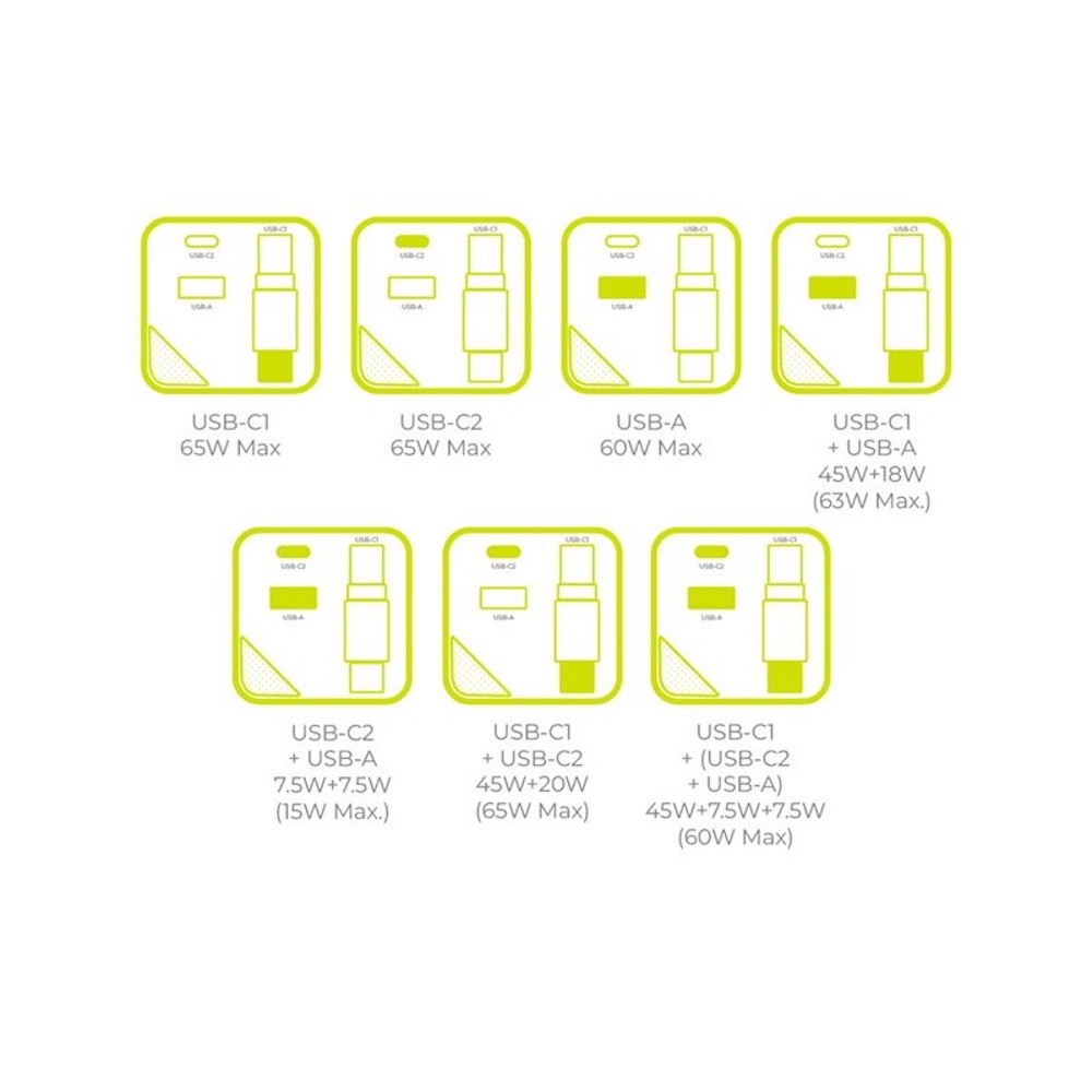 - USB-C1 + USB-A: 45W + 18W (63W Max)