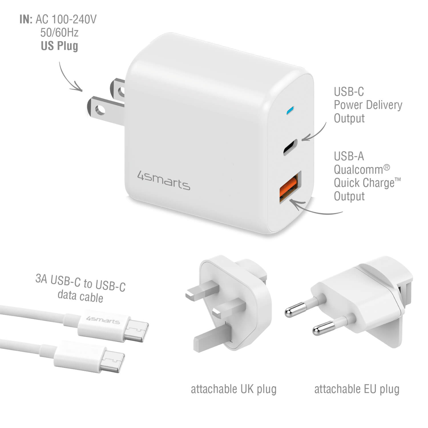 Захранване за ел. мрежа с USB-A и USB-C изходи, USB-C към USB-C кабел и адаптори за USA и UK стандарт (18W) - 4smarts Travel Charger Set VoltPlug QC/PD 18W With USB-C Data Cable (бял)