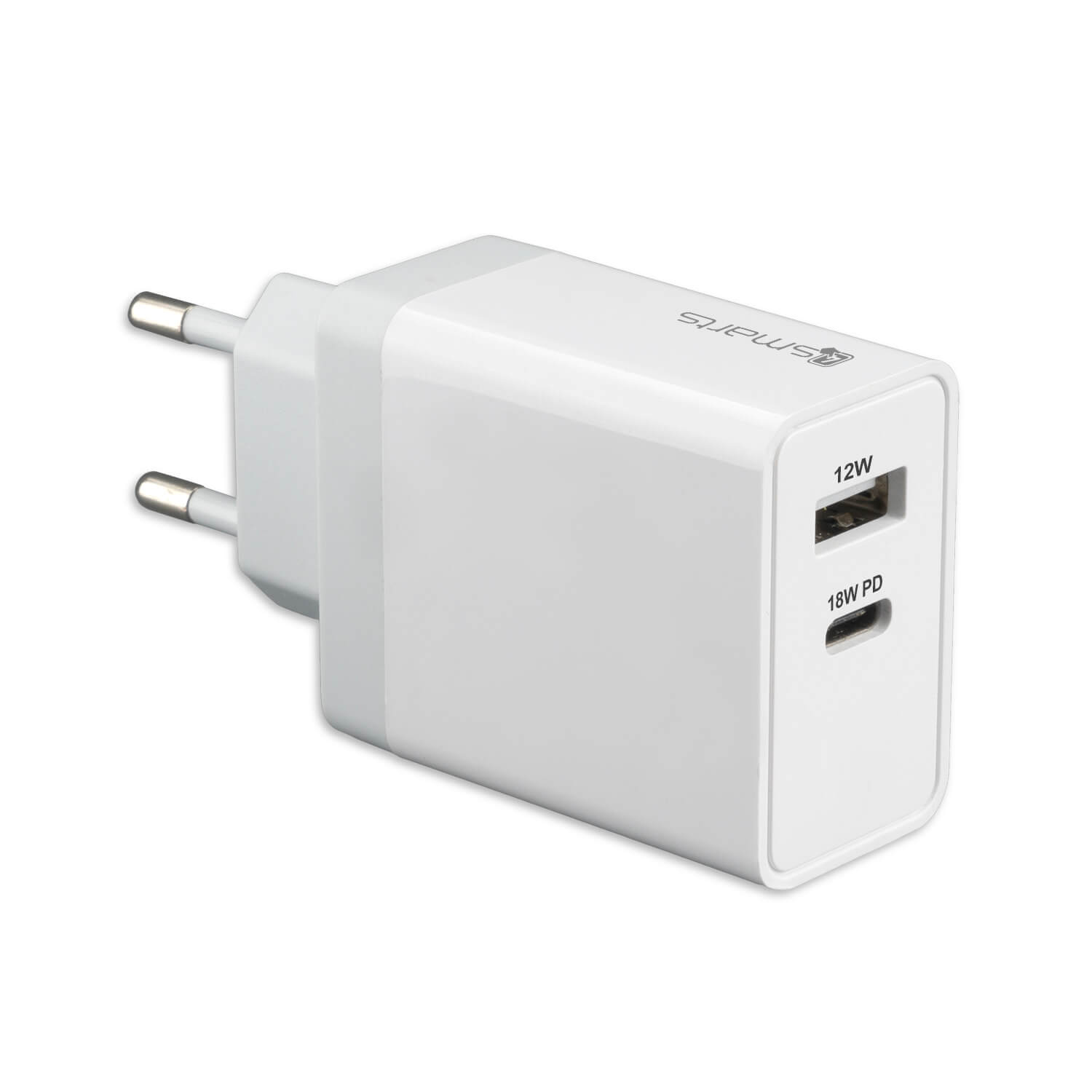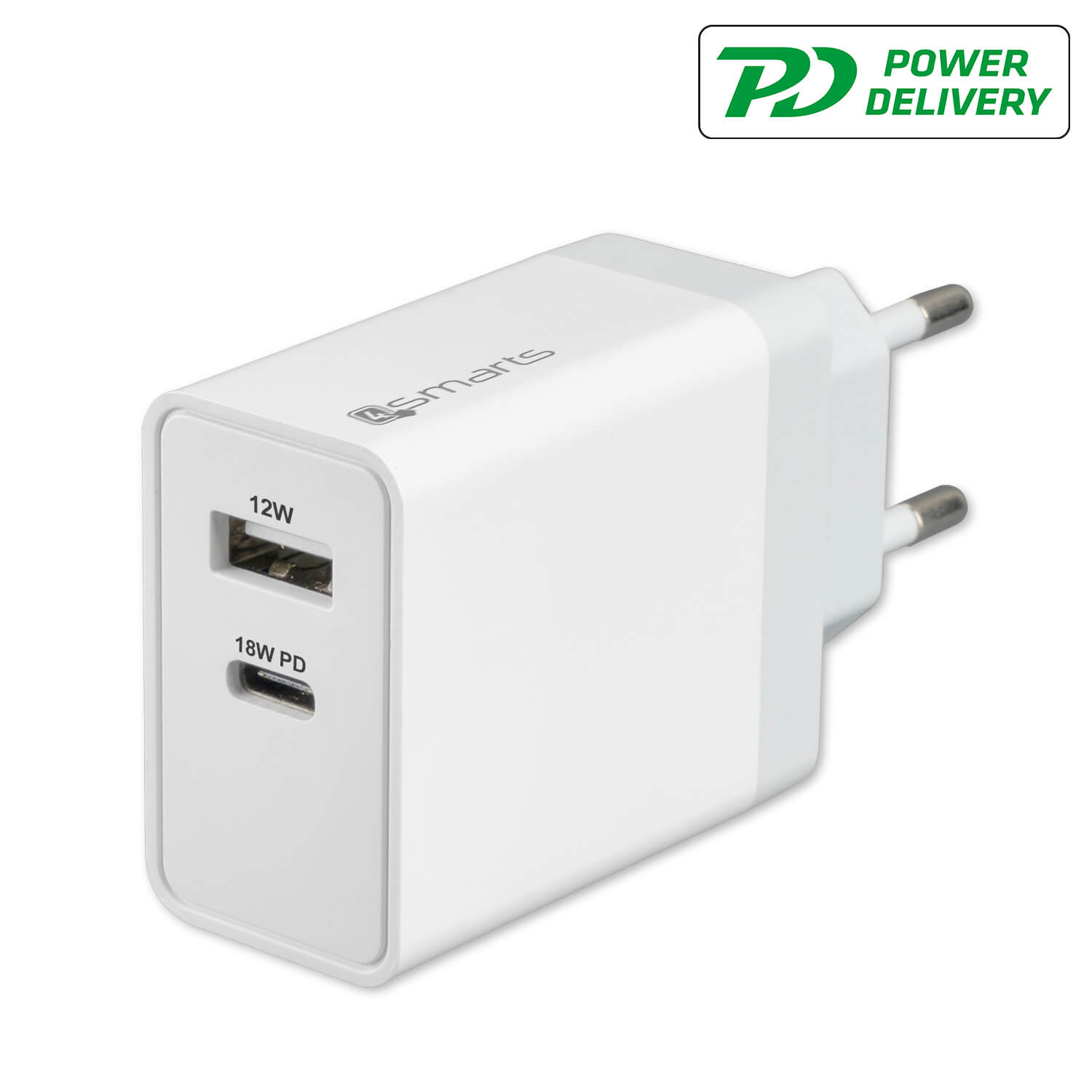 Захранване за ел. мрежа с USB-A изход и USB-C изход (30W) - 4smarts Wall Charger VoltPlug PD 30W (бял)