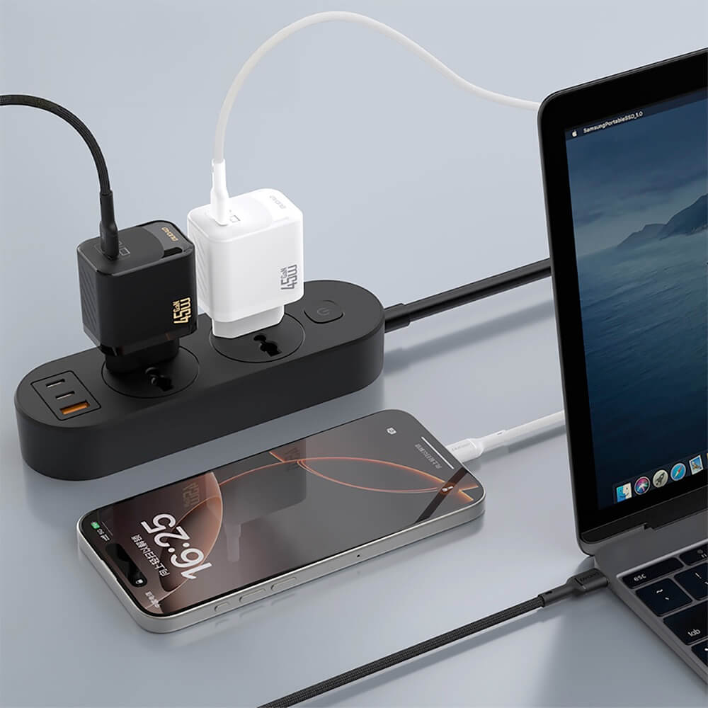 - Леко и компактно захранване, оборудвано с усъвършенстван GaN чип, благодарение на който позволява бързо зареждане с мощност до 45W. Това осигурява бързо зареждане и съвместимост с различни устройства.