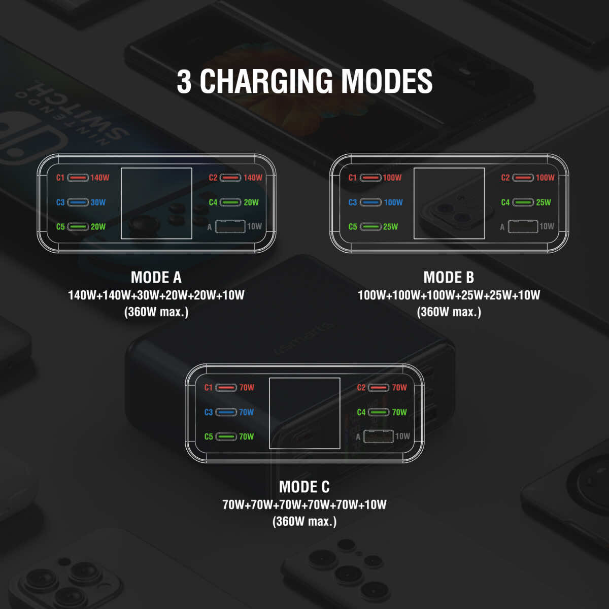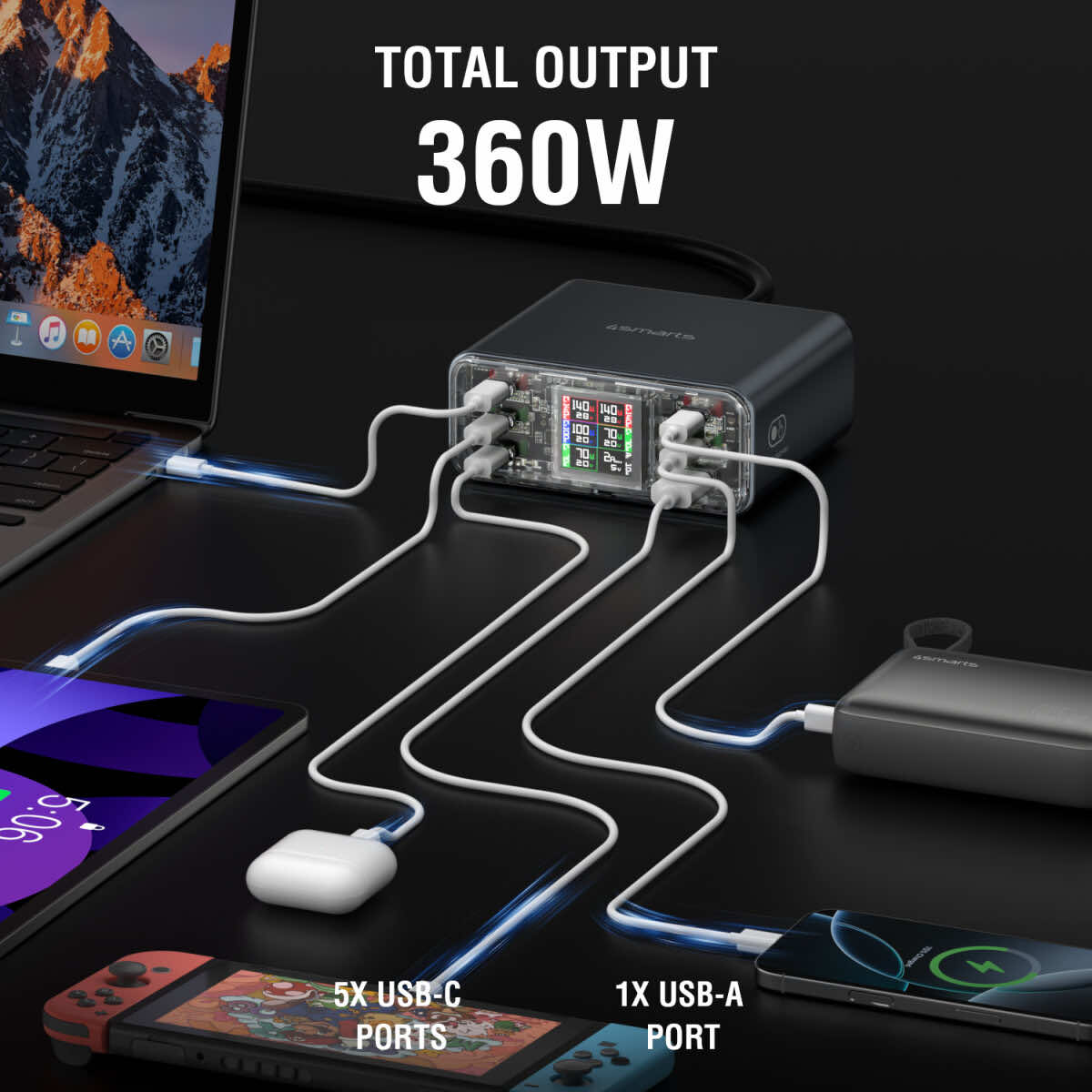 - Мощност: до 360W - Това осигурява бързо и ефективно зареждане на множество устройства.