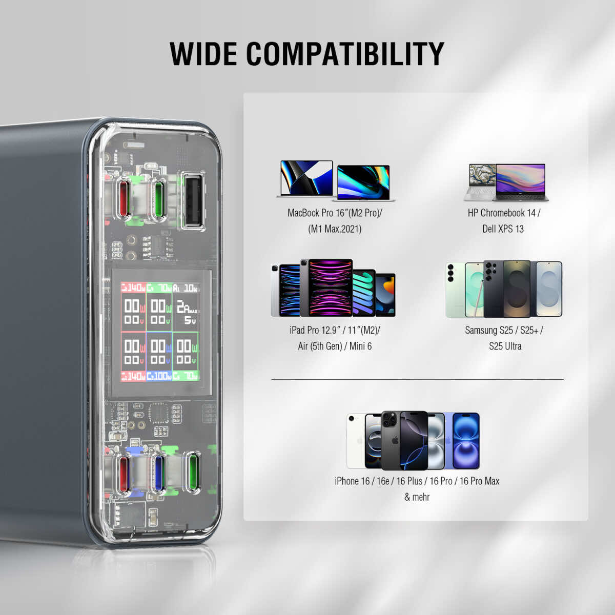 - GaN Technology - Позволява изработка на по-малки и леки устройства с висока ефективност.