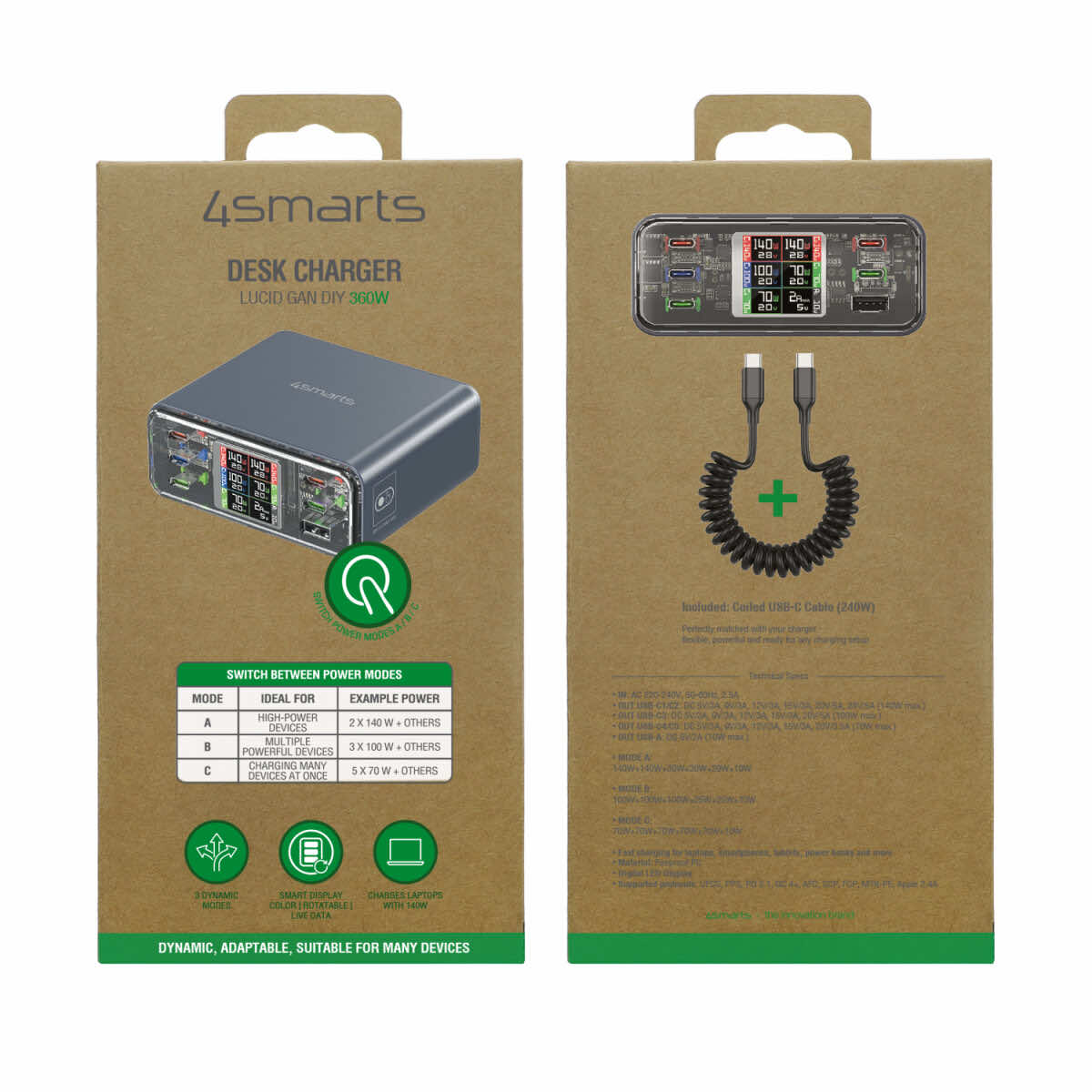 - В комплекта: 1 x 4smarts Desk Charger Lucid GaN DIY 360W, 1 x захранващ кабел, 1 x USB-C към USB-C кабел (240W), 1 x ръководство.