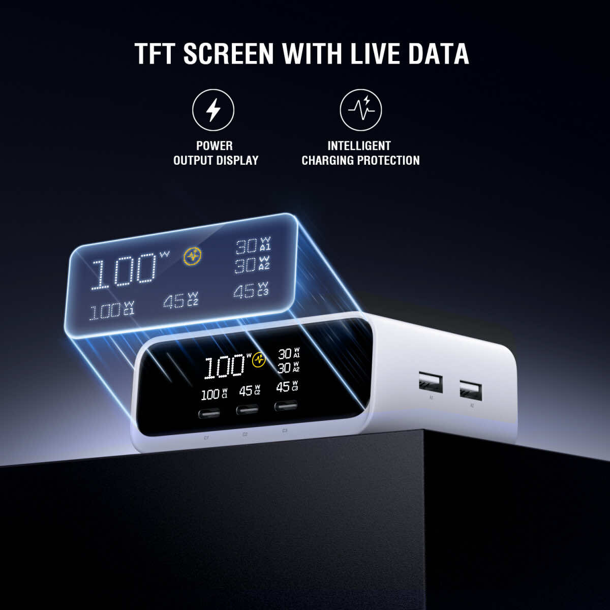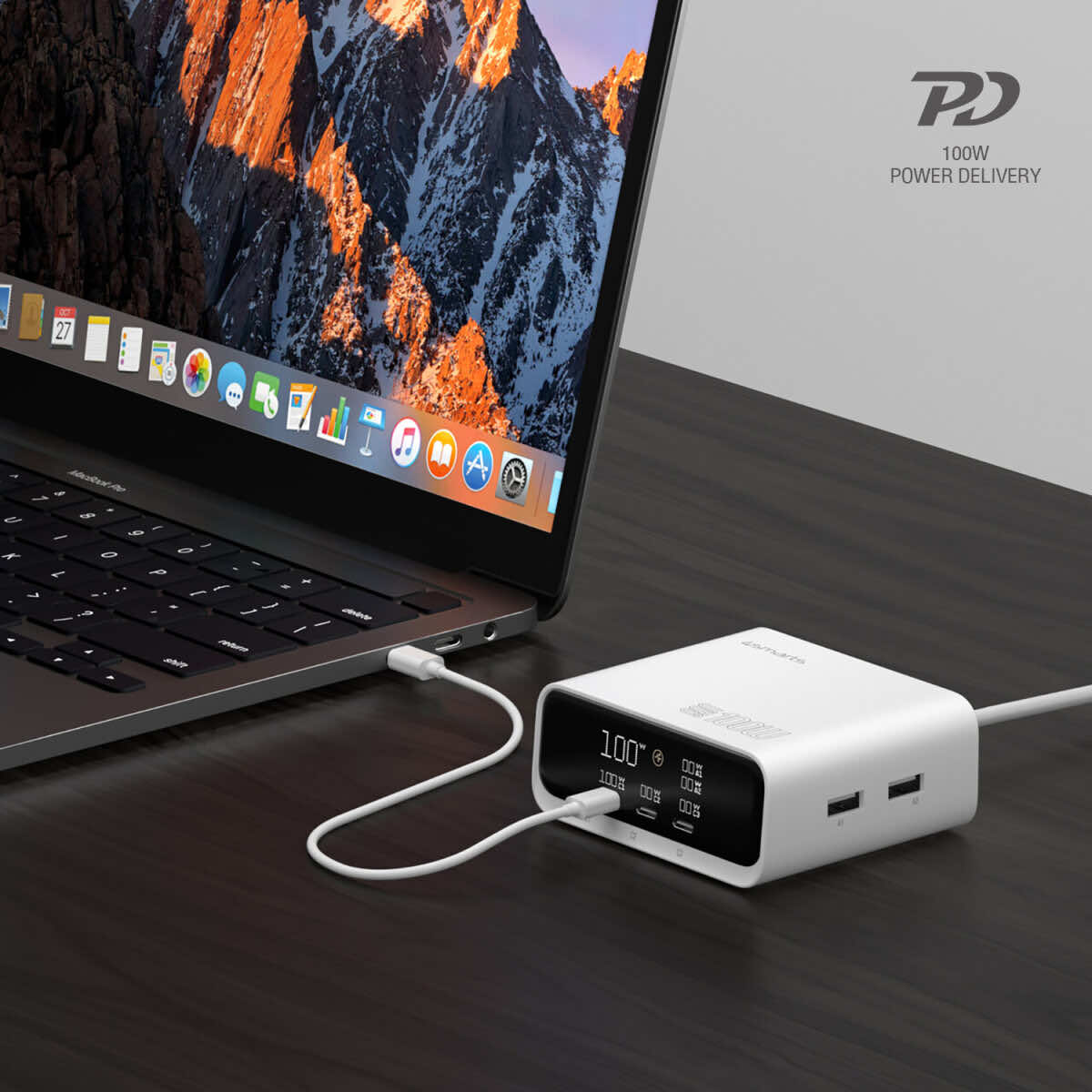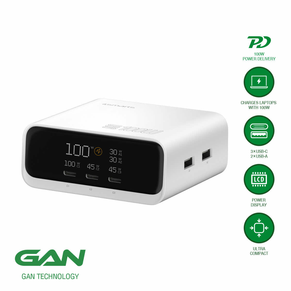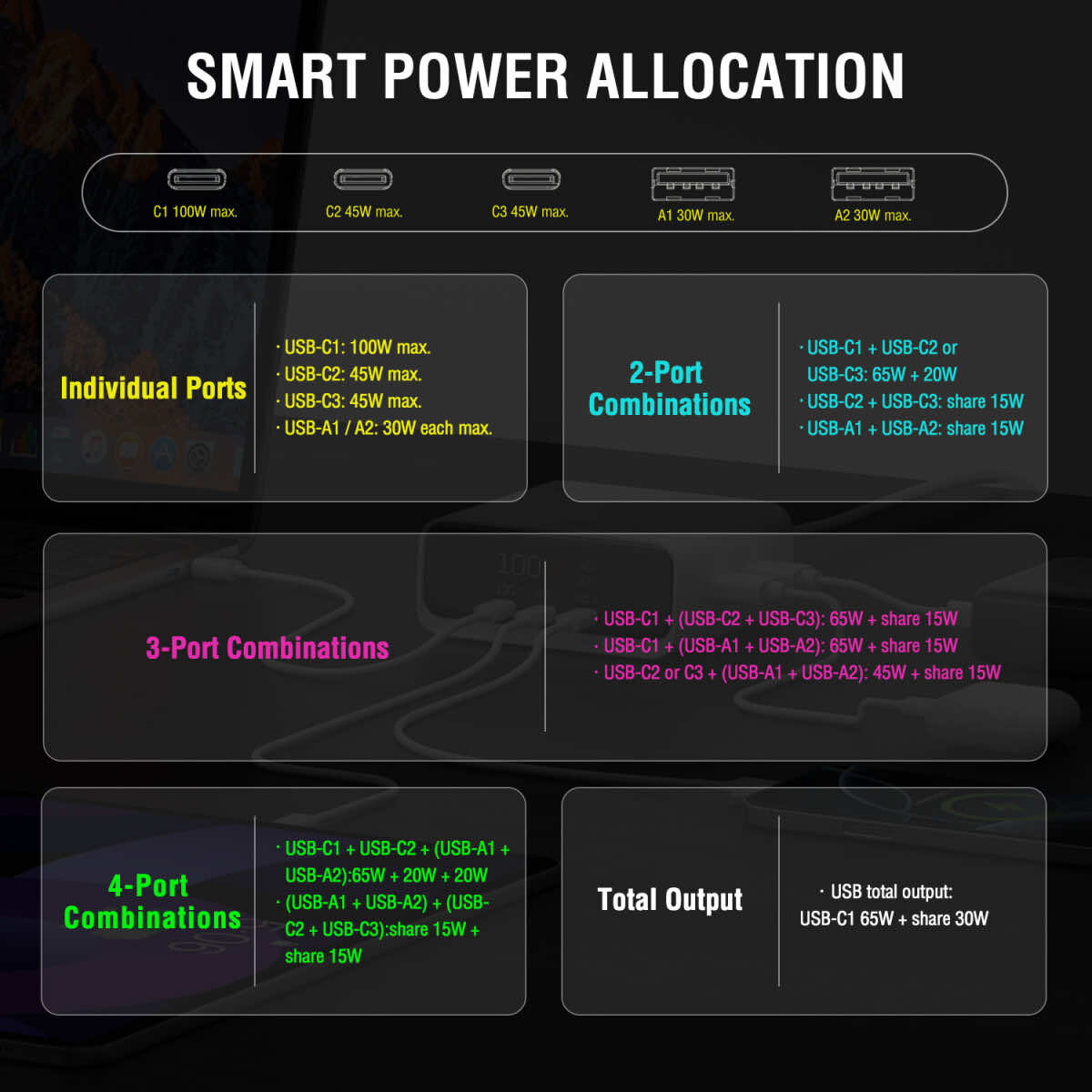 - Зарядното устройство съвместява три USB-C и два USB-A изхода, и интелигентно регулира изходната си мощност според свързаните устройства с до 100W мощност. Това осигурява оптимално зареждане на различни устройства.