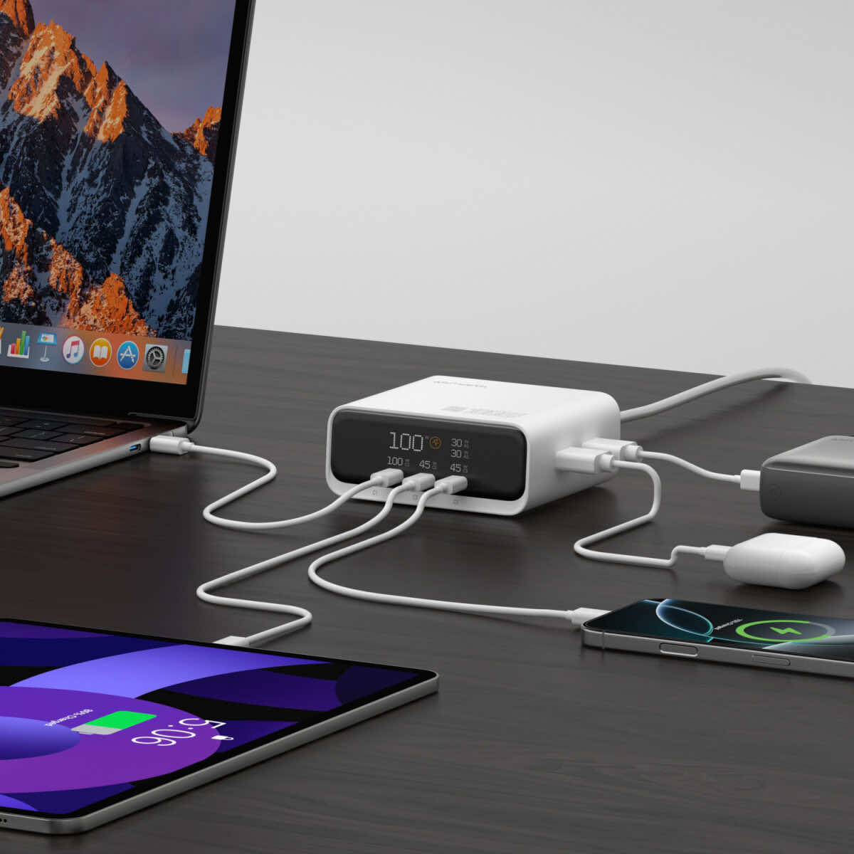 Представяме ви мощното и сигурно зарядно устройство 4smarts Desk Charger GaN Screen 100W, което осигурява до 100W обща мощност, идеално за всички ваши мобилни устройства.