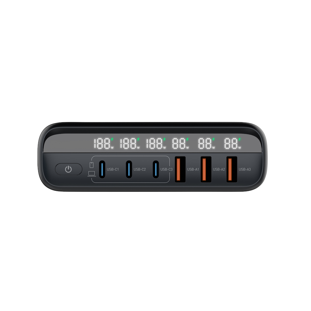 - Зарядното е оборудвано с 3 USB-C порта и 3 USB-A порта, а мощността му достига до 140W. Това осигурява бързо зареждане на различни устройства.