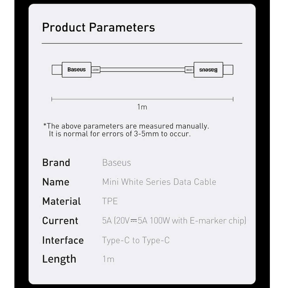 - - 1 x Baseus USB-C към USB-C кабел (100 см)